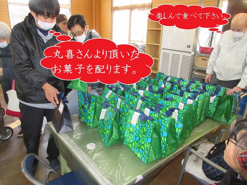 今年も,株式会社丸喜様より、節分用の豆とたくさんのお菓子をいただきました。いただいたお菓子は、利用者のみなさんに定例の「お土産」としてお持ち帰りしていただきました。素敵なプレゼントをありがとうございました。 |