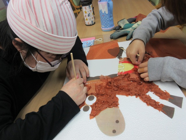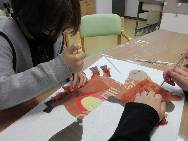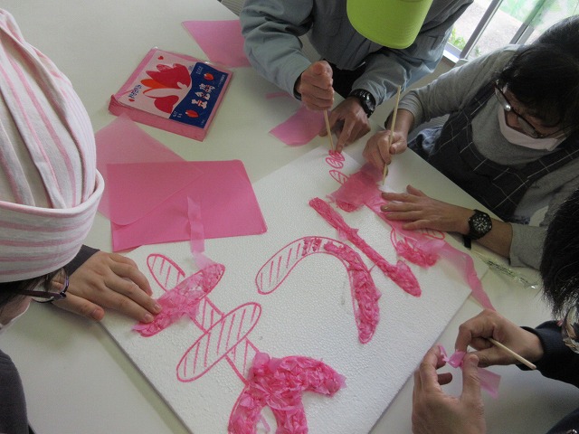 先日の事業団祭で披露した馬の絵は利用者さんの共同作業です。お花紙を発泡スチロールの土台に丁寧に刺していくという少し手間のかかる作業でした。この工程によって、出来上がりがふわっとした立体感のある豪華な「午」に仕上がりました。利用者さんが心を込めて制作した壁面は、来月に山陽総合事務所一階ラウンジに展示予定です。 ![]() |