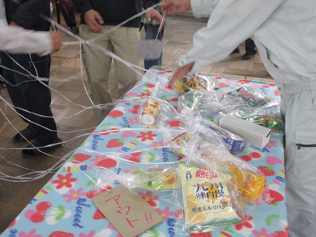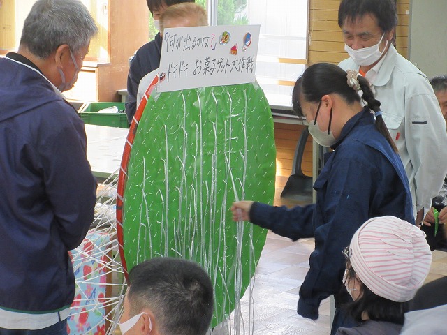 | 「これだ!」と決めたひもを引くと、目の前には期待と緊張の瞬間が。景品のお菓子を引き当てて大喜びする方もいれば、中には4回連続で「ハズレ」を引いてしまい、真剣に悔しがる方も…その一喜一憂の様子に、会場は大いに盛り上がりました。 |