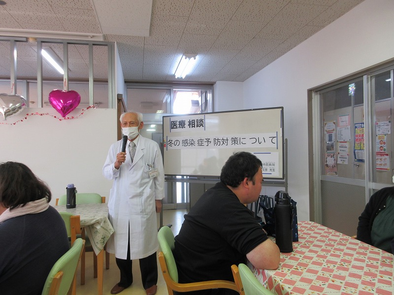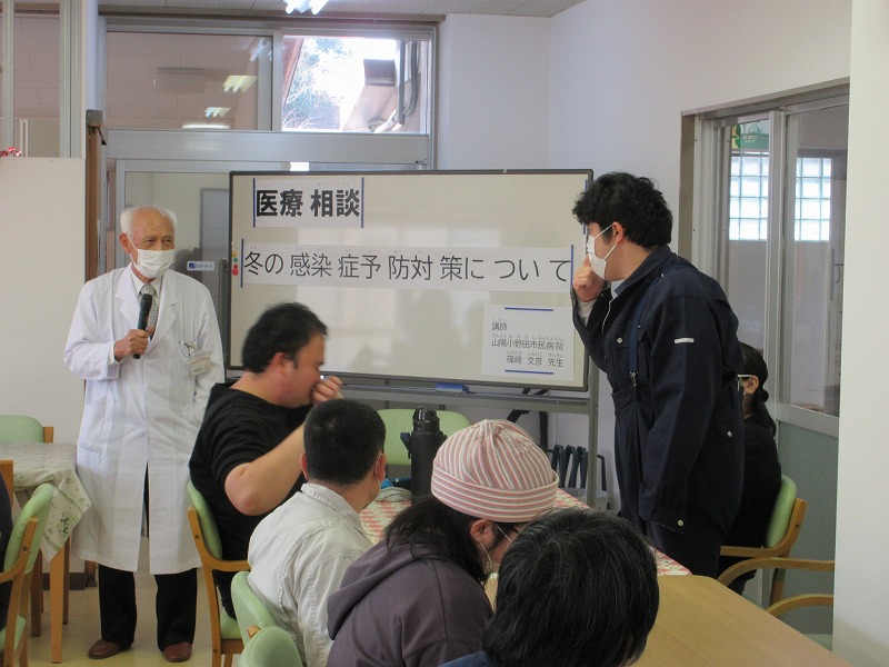 山陽小野田市民病院の篠崎医師をお迎えして、医療相談を開催しました。『冬の感染症予防対策』をテーマにお話をしていただきました。講義後の質疑応答では、利用者さんからも質問が多数寄せられ、大いに盛り上がりました。 |