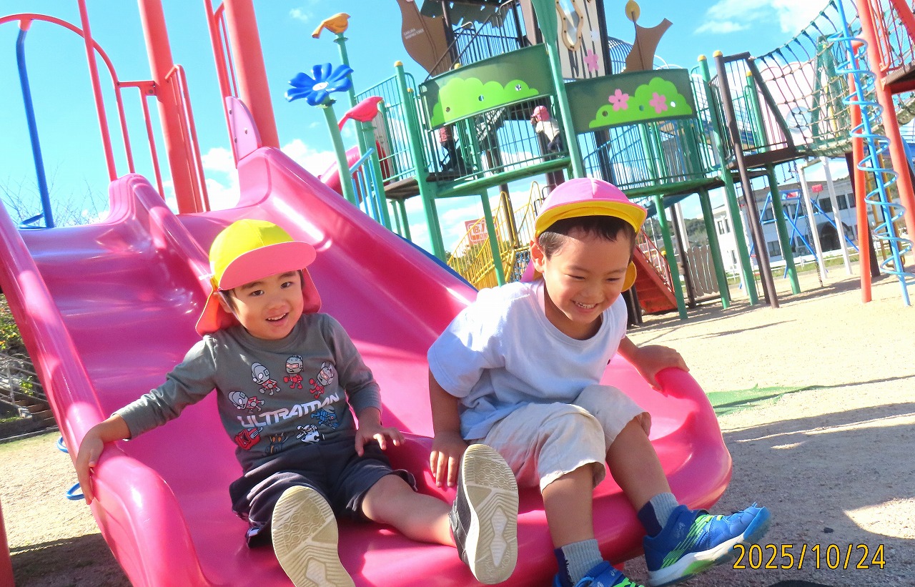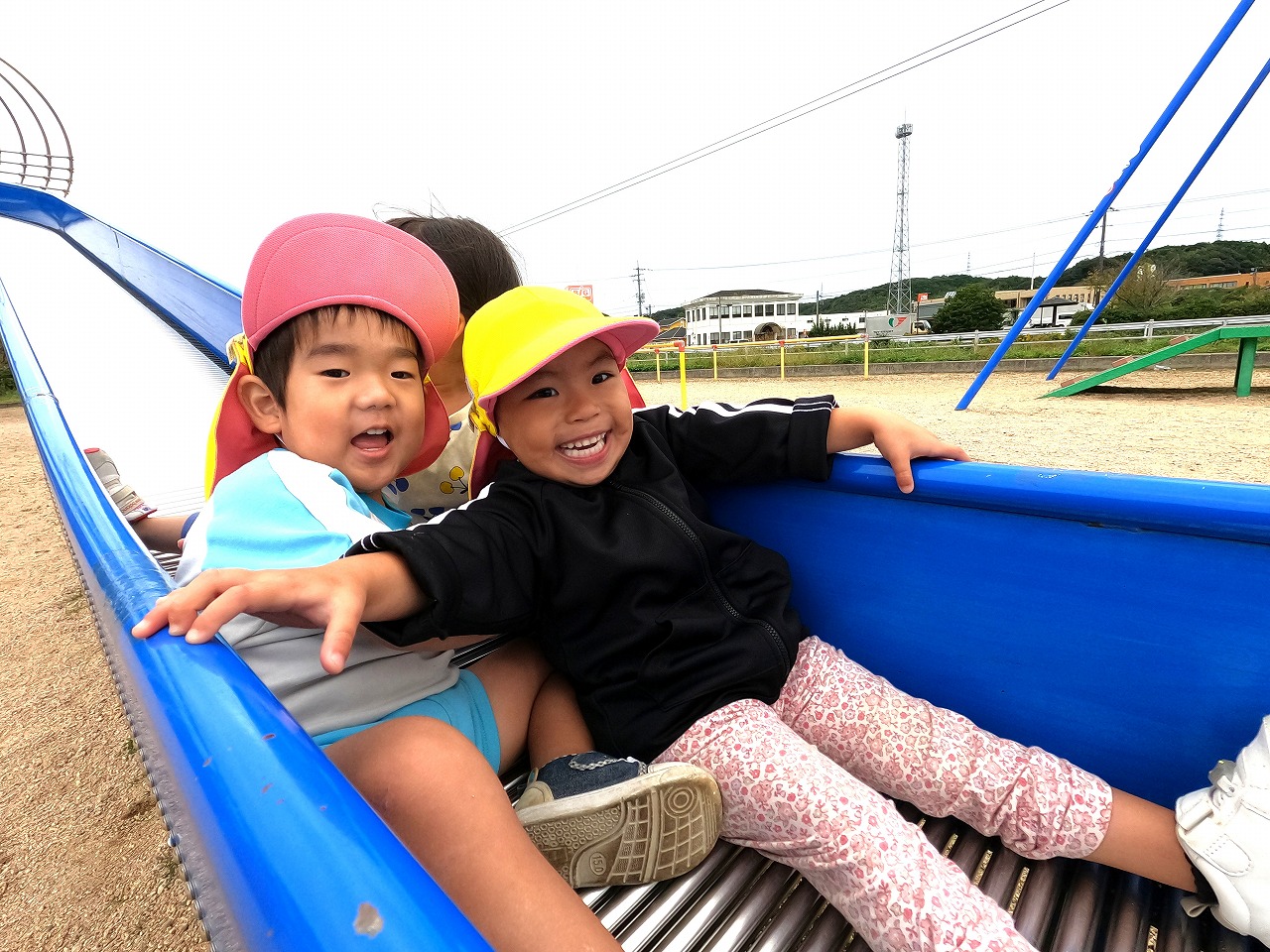 | 遠足ウィーク最終日!とっても良い天気に恵まれました☆ Cグループは、美祢市のさくら公園へ、出発! 〇「1、2の3!!」タイミングを合わせて滑ったよ! 〇お友だちと一緒、楽しいな☆ 〇みんなで、おやつタイム♪「う〜ん、おいしい☆」 ![]() |