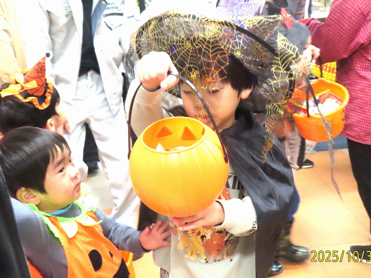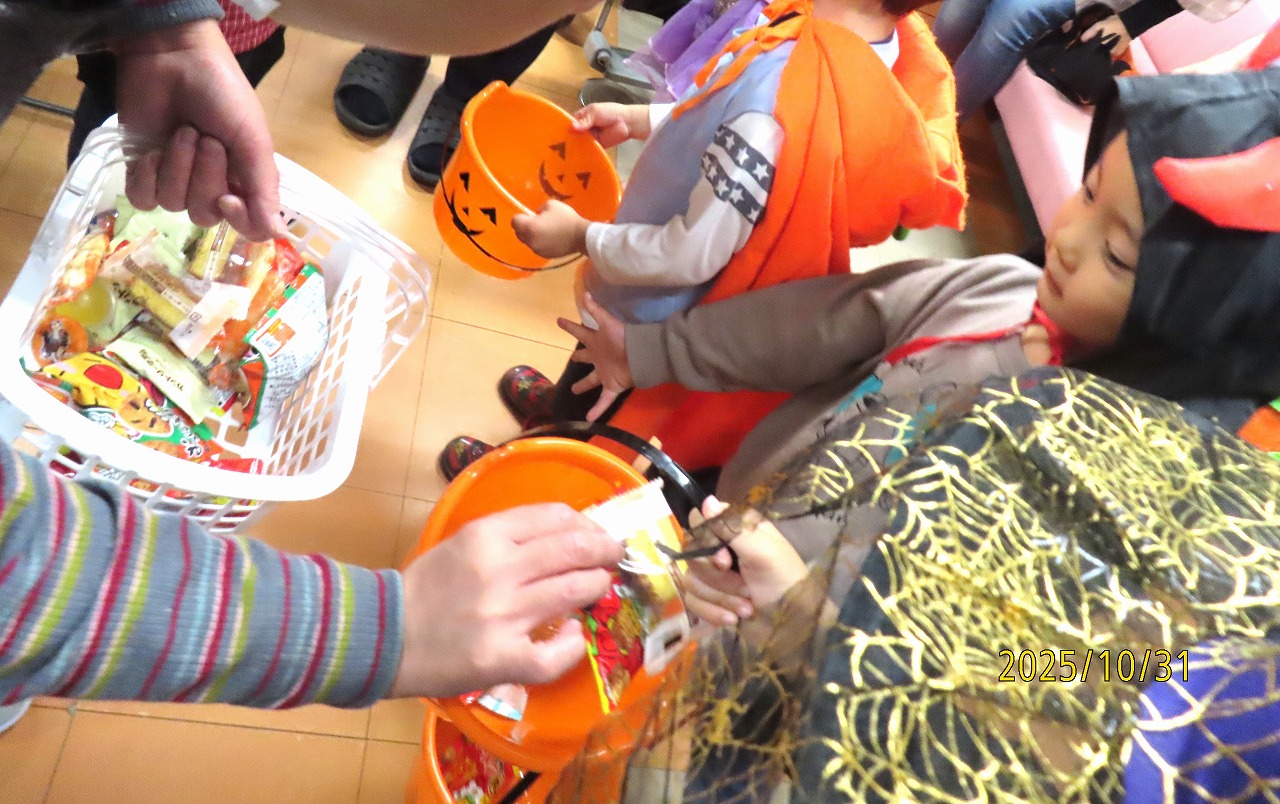 | 同法人の「みつば園」と「のぞみ園」にお出かけしました☆ 「トリックオアトリート!」合言葉を皆で言って、お菓子をたくさんいただきました♪ 自分の持っているカゴに入れてもらい、「わ〜い!」「やったね!」と大喜び!! ご協力いただきました皆様、ありがとうございました。 ![]() |