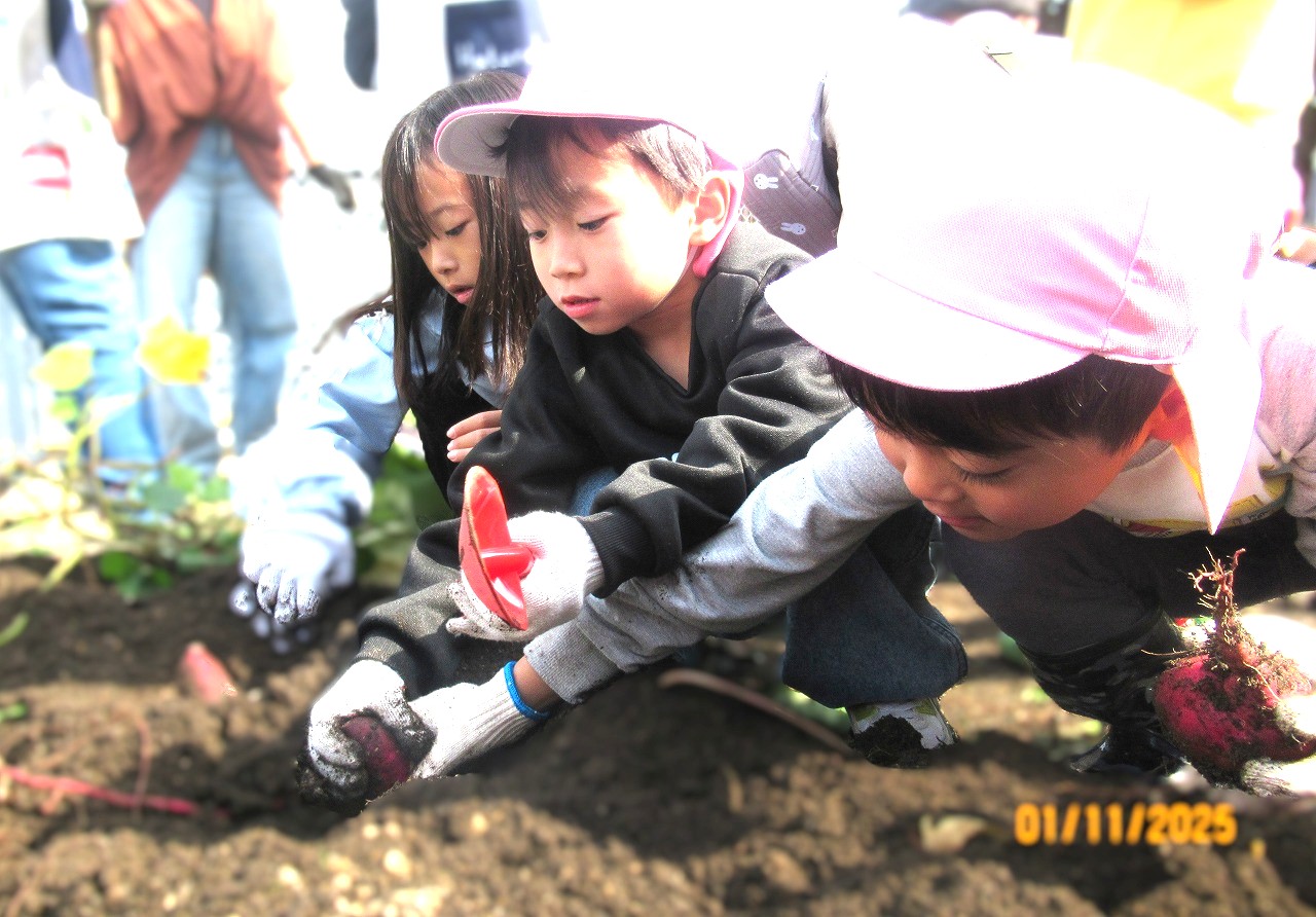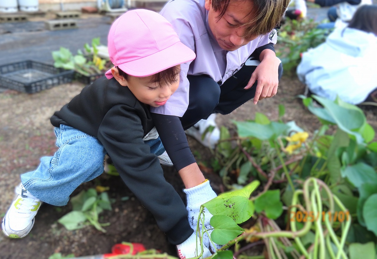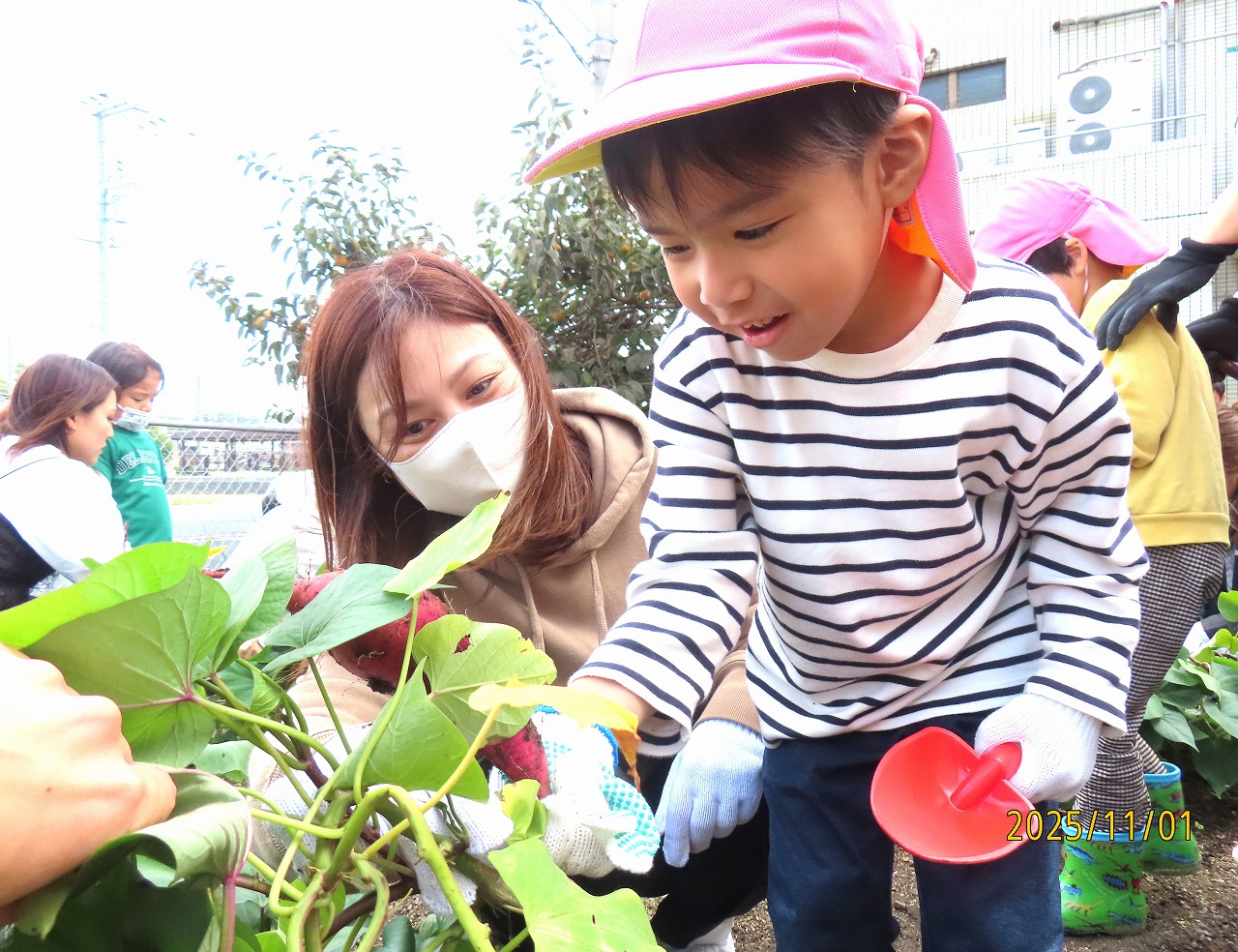| 土曜日参観のため、ご家族みなさんお揃いで、たくさんご参加していただきました! 朝の会の後は、待ちに待った「芋ほり」♪ 先週のうちに畑に行き、お芋の成長具合は確認しています☆ ご家族やお友だちと、ツルを引っ張ってお芋ほりを楽しみました♪ ![]() |