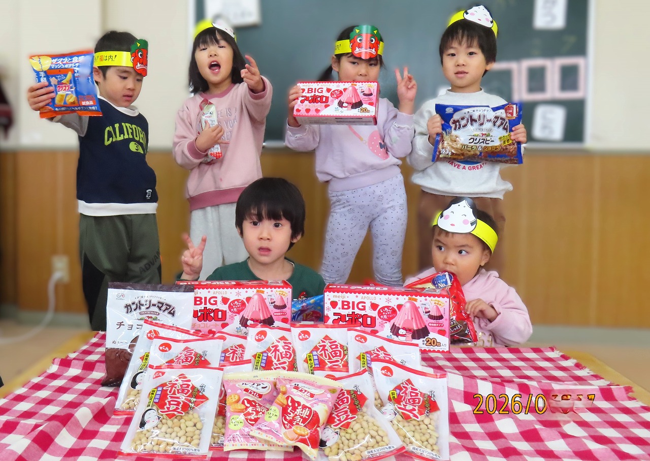 | 今年も「株式会社丸喜」様より、たくさんのお菓子を寄贈していただきました。 皆様のご厚意に感謝申し上げます。 節分のお面や豆をたくさんいただき、節分行事の準備もバッチリできました☆ 〇たくさんのお菓子に、ワクワク♪ 〇早く食べたいな… |