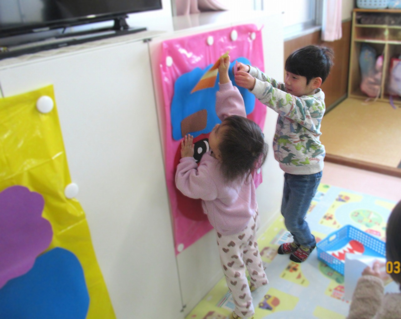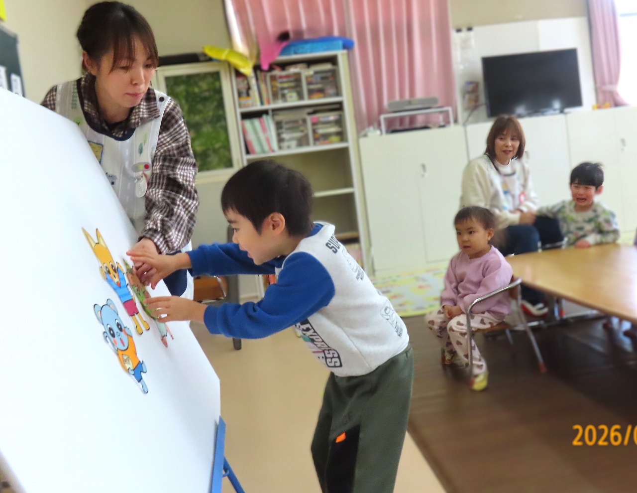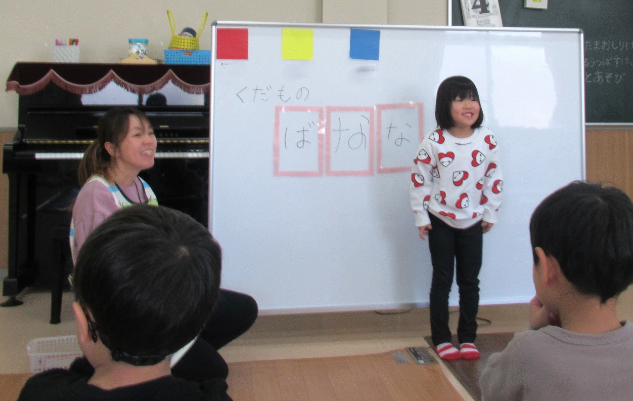 | 〇ニコニコ笑顔で、ピアニカ演奏、頑張りました♪ 〇乗り物クイズに挑戦!写真を見て、「しきしま、船です!」堂々と答えてくれました☆ 〇道路標識博士の登場です!標識を見て、すぐに答えを選んで貼ってくれました! ![]() |