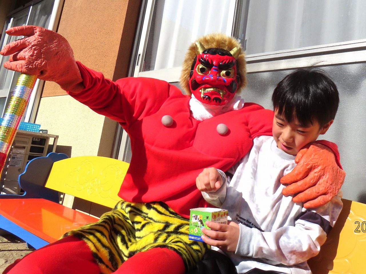| 〇豆まきのマスを持ったまま、オニにつかまってしまいました! 〇「僕もオニにつかまっちゃった〜!」 〇「僕は、怖くないもん☆」余裕で記念撮影♪ ![]() |