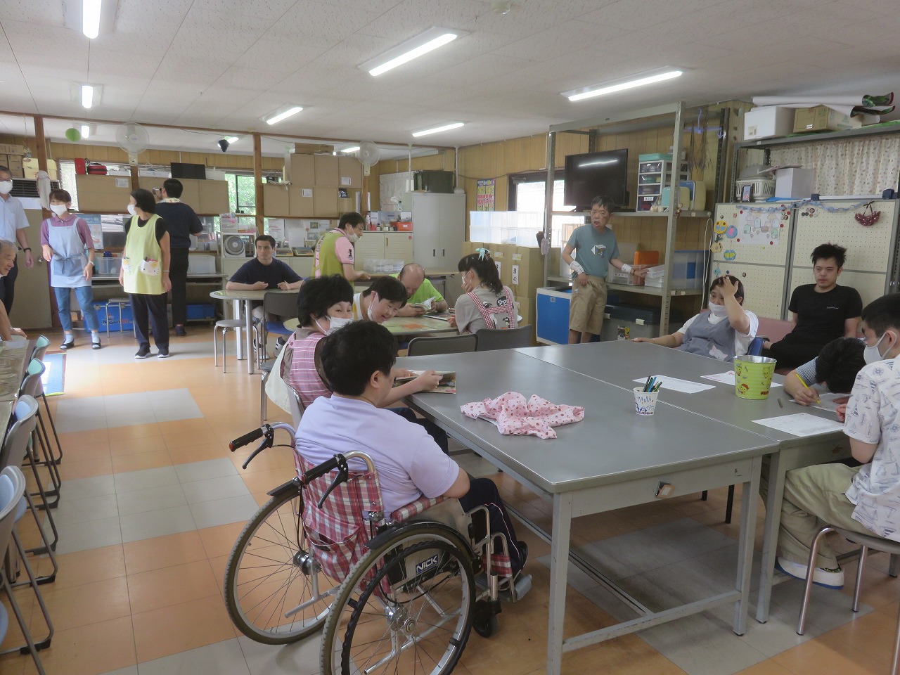 7/4の七夕会の時に皆で7月の壁面を作りました。日中活動で準備をし、当日にはきれいなものを貼ることが大好きな利用者さんが集まり、最後の仕上げをされています。その後も、七夕の飾りをご自宅で作られた利用者さんが自由に貼ってくれ、のぞみ園らしい作品へと仕上がりました。![]() ![]() ![]() |