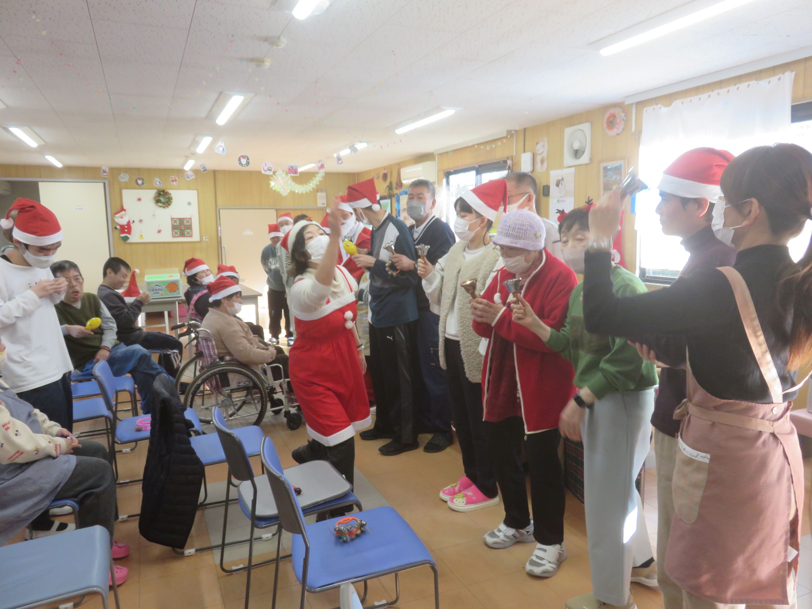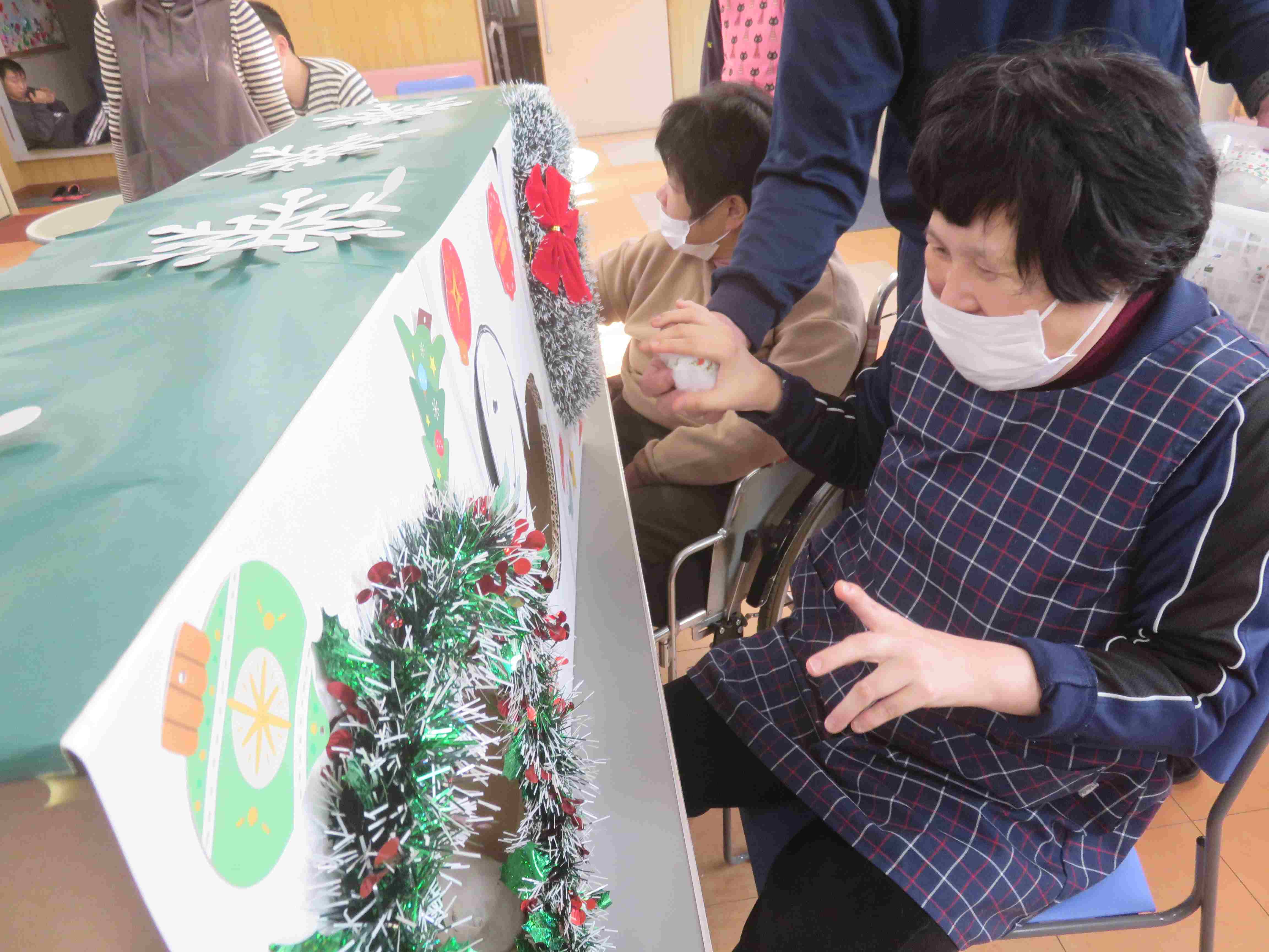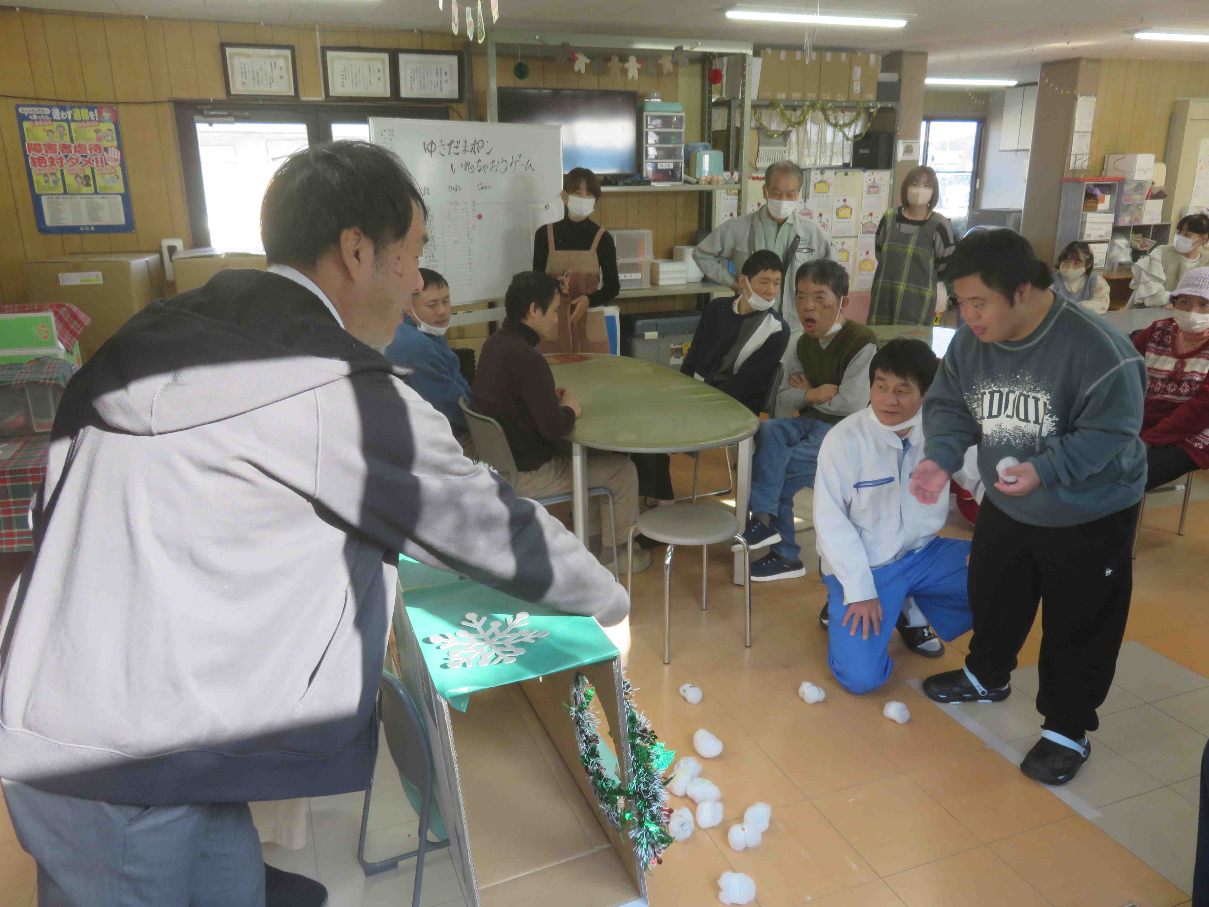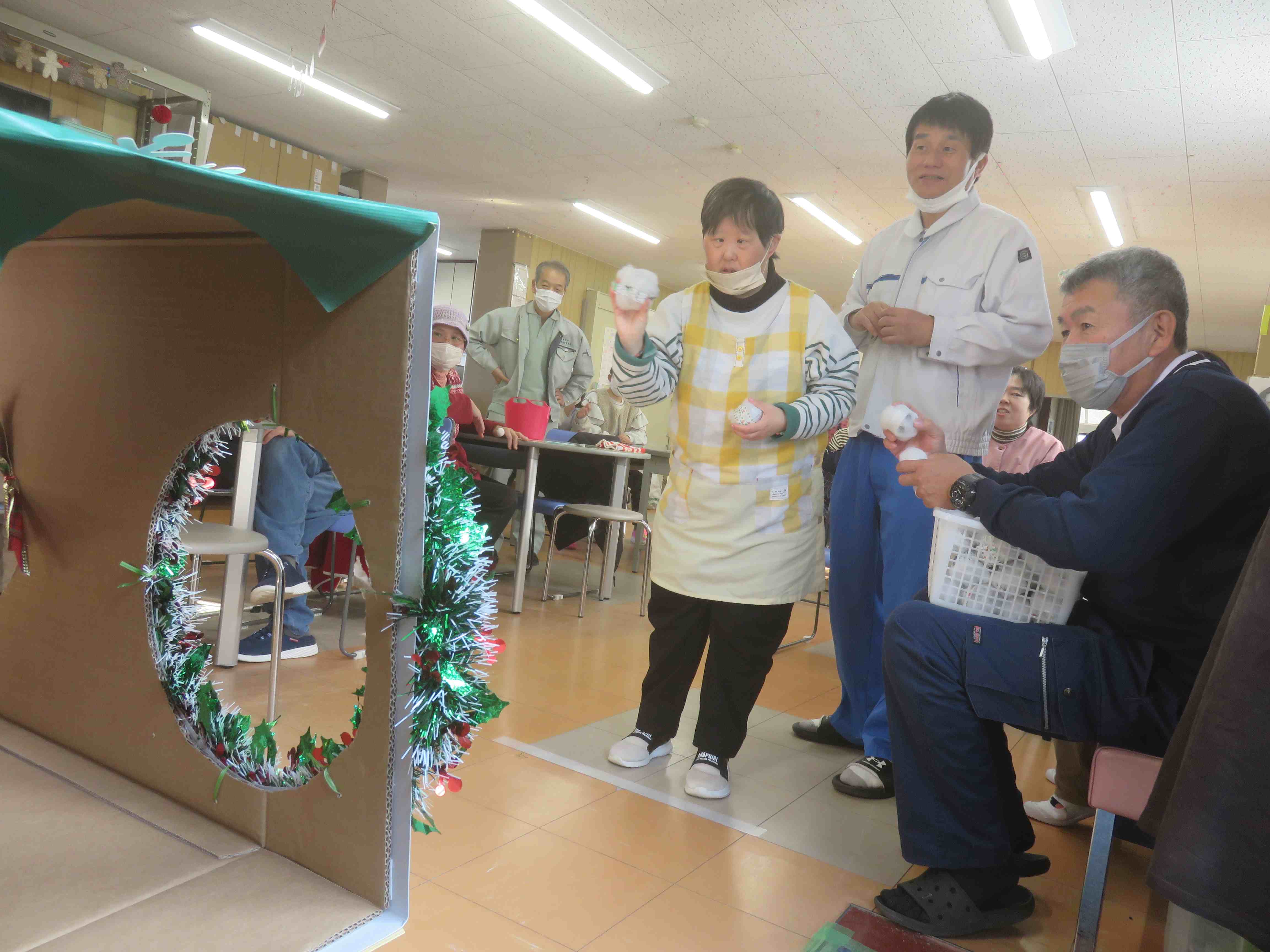 メリークリスマス!本日、待ちに待ったクリスマス会を開催しました。会場は手作りの飾りで彩られ、朝からワクワクした空気に包まれました。午前の部は、職員と利用者さんで作り上げた特製ゴールに雪玉を投げ入れるゲームに挑戦。「それっ!」「入ったー!」と歓声が上がり、皆さん身を乗り出して夢中で参加されていました。 ![]() |