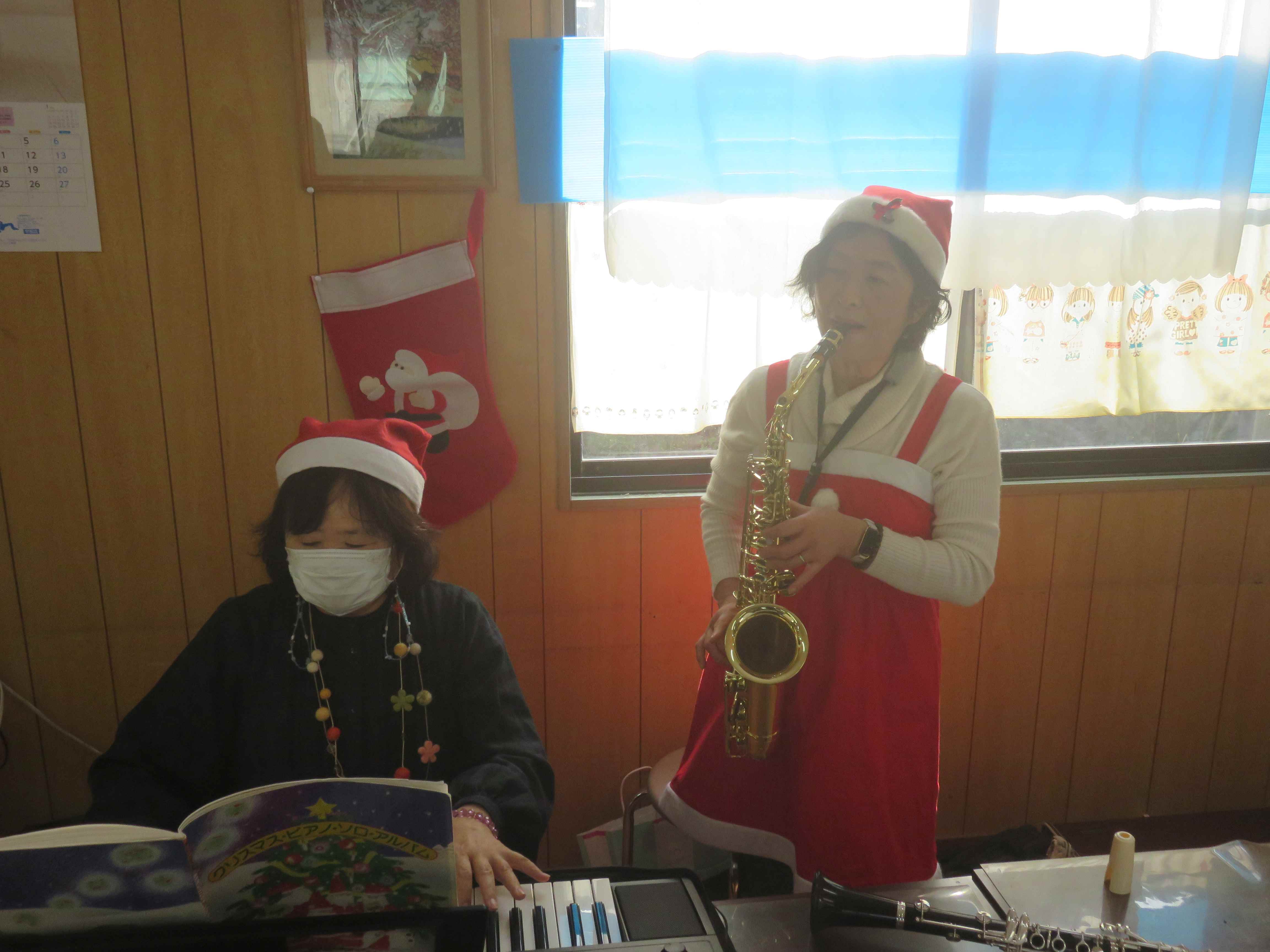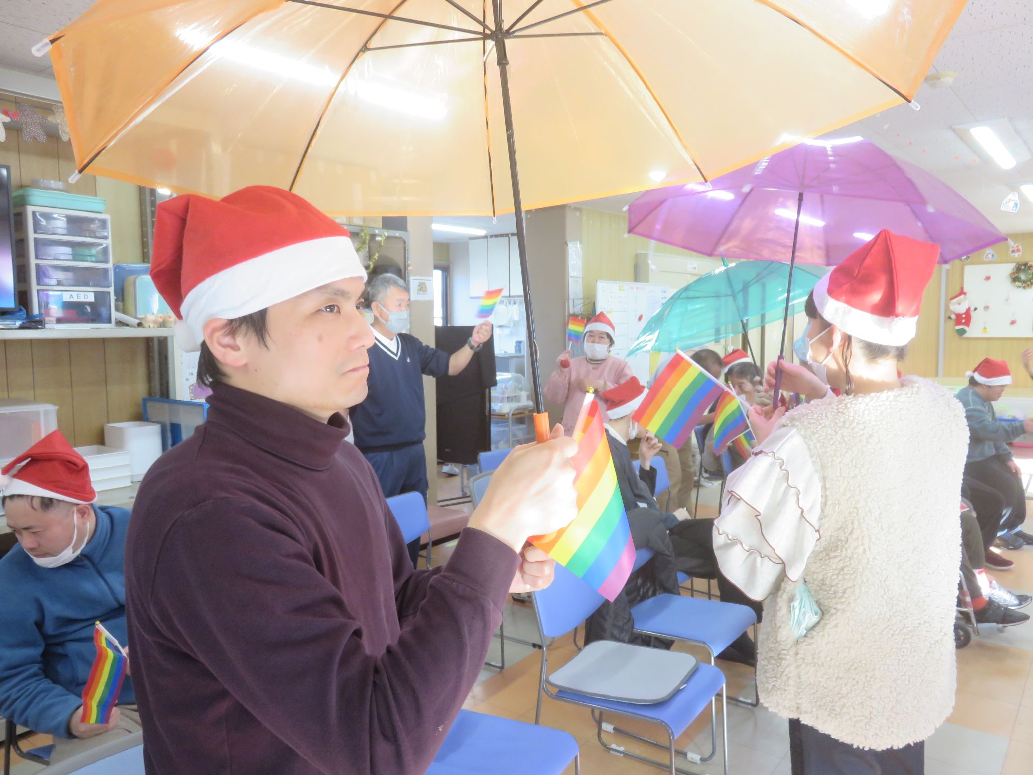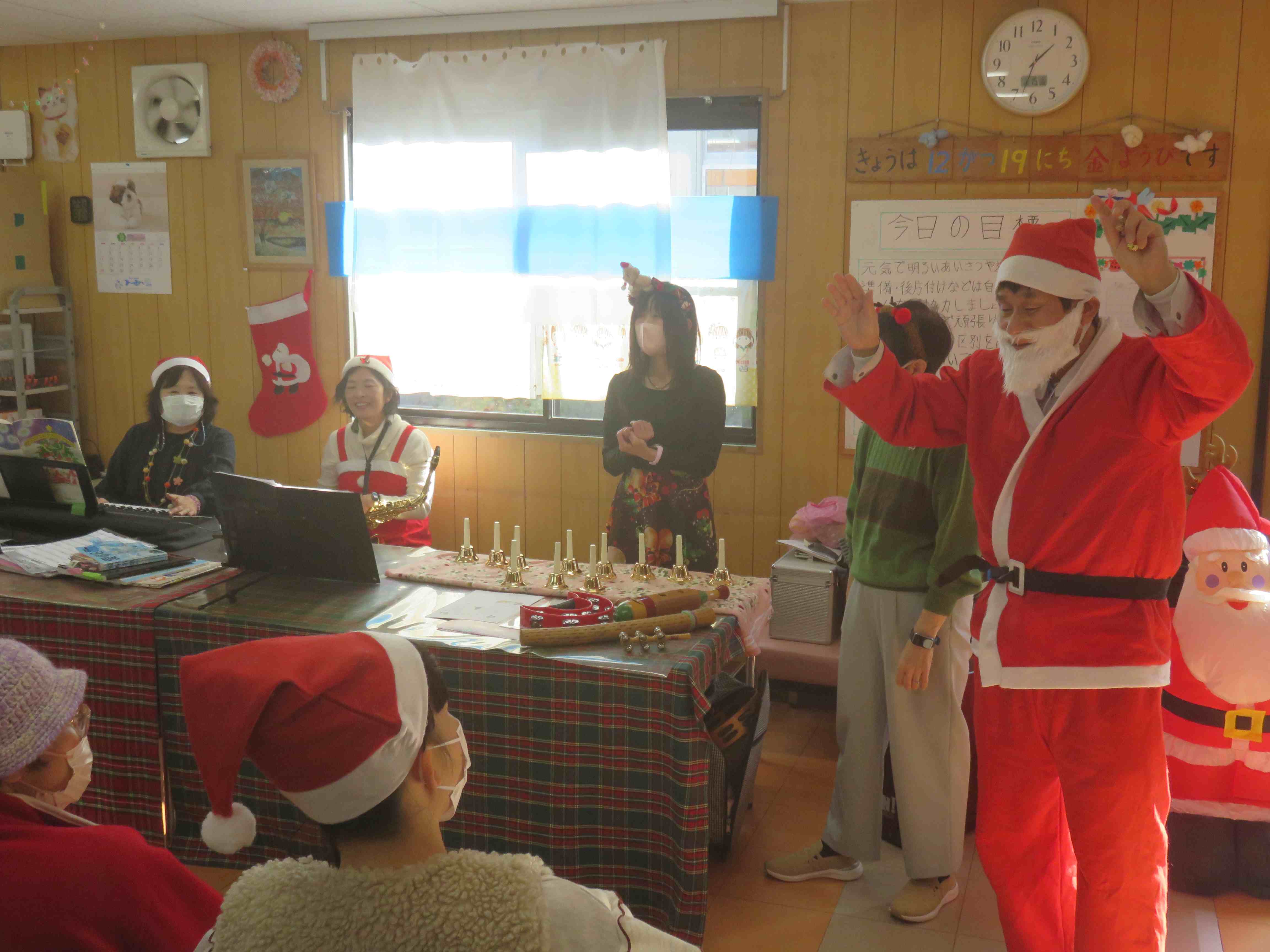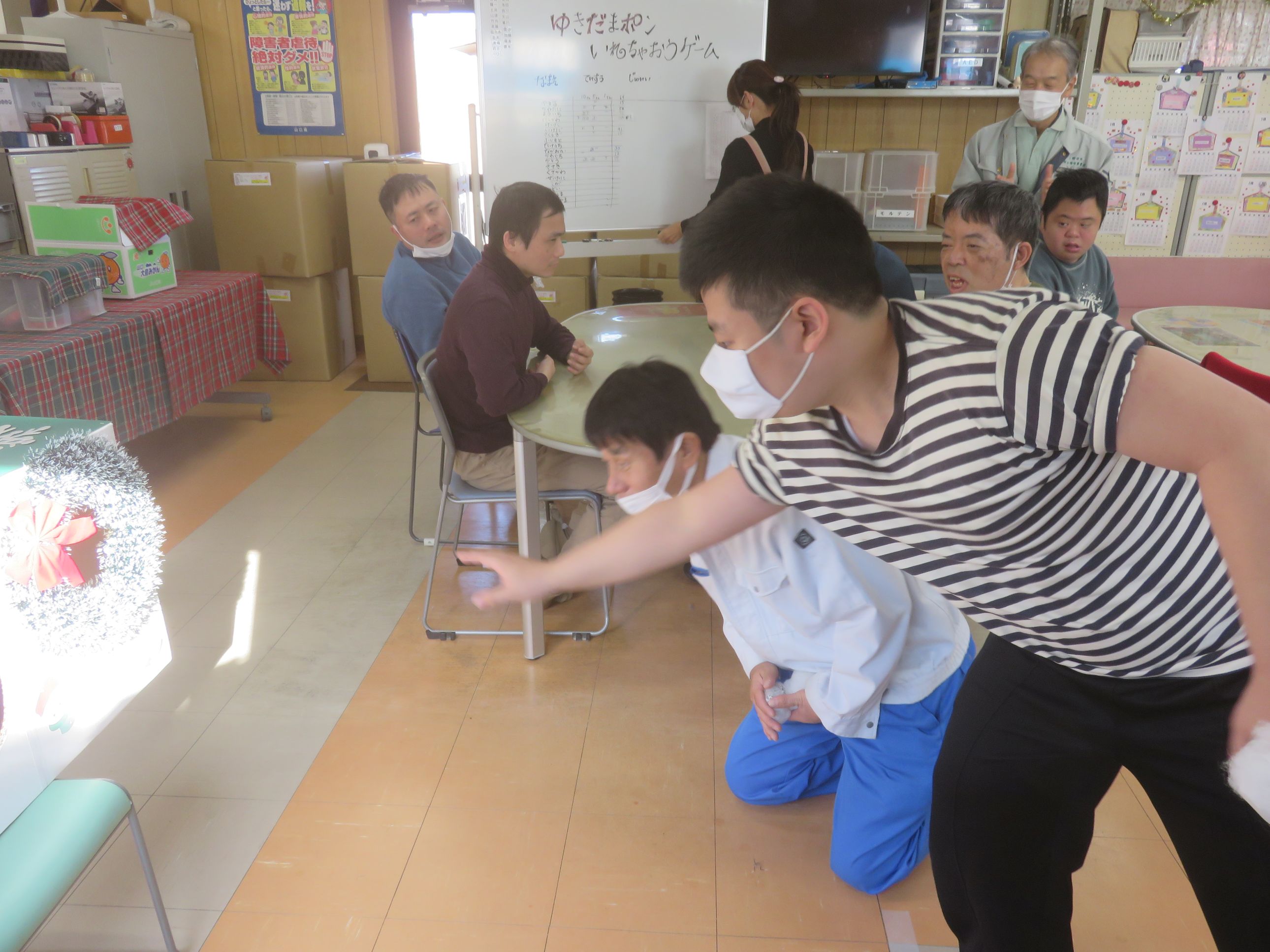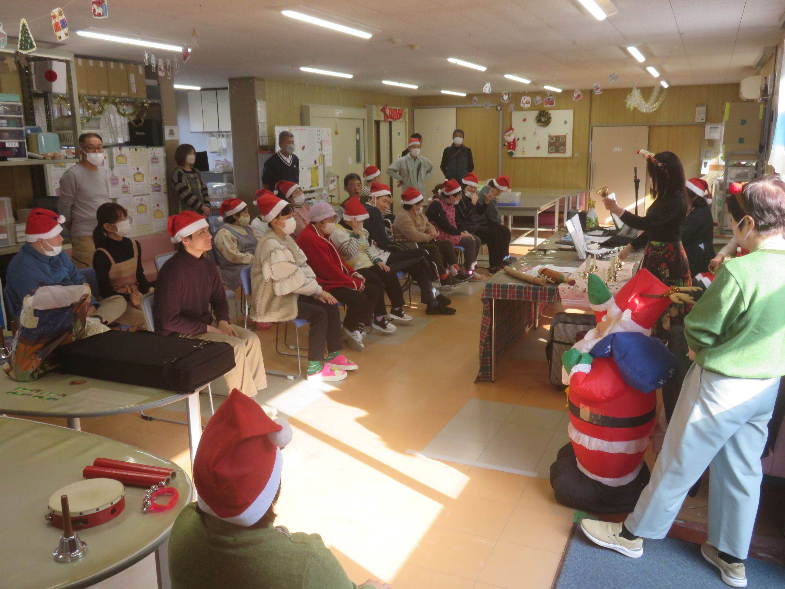 メリークリスマス!本日、待ちに待ったクリスマス会を開催しました。会場は手作りの飾りで彩られ、朝からワクワクした空気に包まれました。午前の部は、職員と利用者さんで作り上げた特製ゴールに雪玉を投げ入れるゲームに挑戦。「それっ!」「入ったー!」と歓声が上がり、皆さん身を乗り出して夢中で参加されていました。 ![]() |
