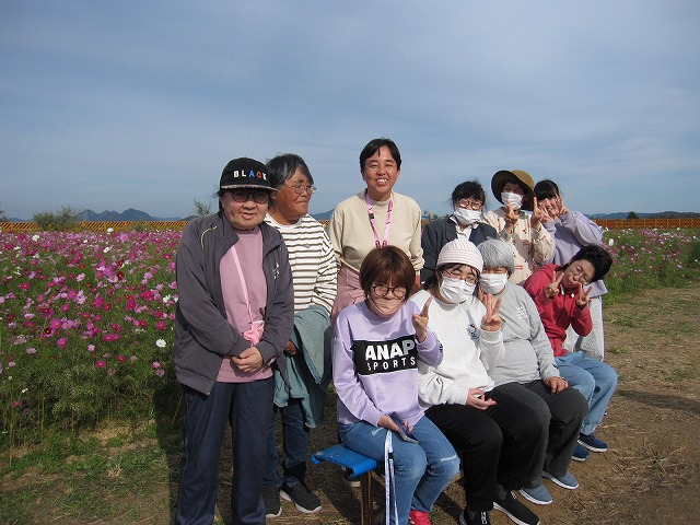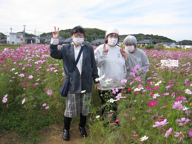 女子グループは近くのコスモス畑へ。ちょうどコスモスが満開を迎えており、風に揺れるピンクや白の可憐な花々に囲まれて記念撮影を楽しみました。美しい秋の景色に、皆さん素敵な笑顔でした。 ![]() |
